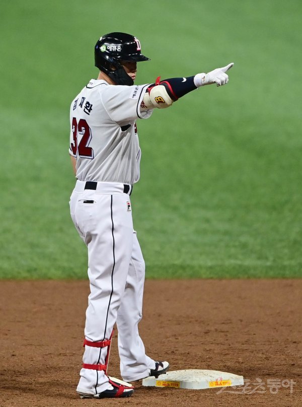 20일 서울 고척스카이돔에서 ‘2020 신한은행 SOL KBO리그’ 한국시리즈 3차전 두산 베어스와 NC 다이노스의 경기가 열렸다. 3회말 무사 1루 두산 김재환이 중전 안타를 쳐낸 뒤 NC 중견수 알테어의 실책으로 2루를 밟은 뒤 세리머니를 하고 있다. 고척 | 주현희 기자 teth1147@donga.com