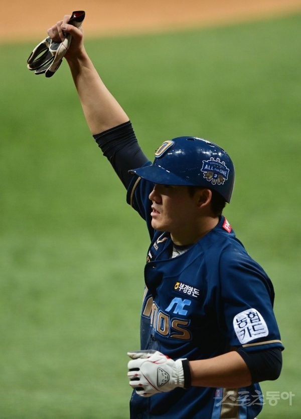 20일 서울 고척스카이돔에서 ‘2020 신한은행 SOL KBO리그’ 한국시리즈 3차전 두산 베어스와 NC 다이노스의 경기가 열렸다. 2회말 2사 3루 NC 양의지의 타석 때 3루주자 박민우가 두산 포수 박세혁의 포일을 틈타 홈으로 파고들어 득점에 성공한 뒤 기뻐하고 있다. 고척 | 주현희 기자 teth1147@donga.com