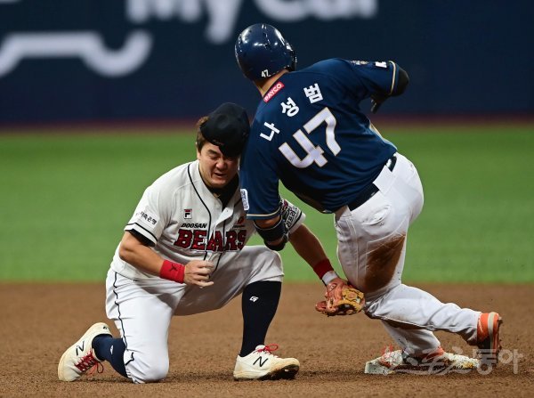 21일 서울 고척스카이돔에서 ‘2020 신한은행 SOL KBO리그’ 한국시리즈 4차전 두산 베어스와 NC 다이노스의 경기가 열렸다. 4회초 무사 1루 NC 양의지의 타석 때 두산 2루수 최주환이 도루를 시도하는 1루주자 나성범을 태그 아웃시키고 있다.