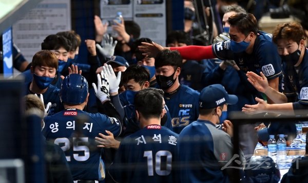 21일 서울 고척스카이돔에서 ‘2020 신한은행 SOL KBO리그’ NC 다이노스와 두산 베어스의 한국시리즈 4차전 경기가 열렸다. 6회초 2사 3루에서 NC 강진성의 1타점 적시타 때 득점에 성공한 양의지가 동료들의 환영을 받고 있다.