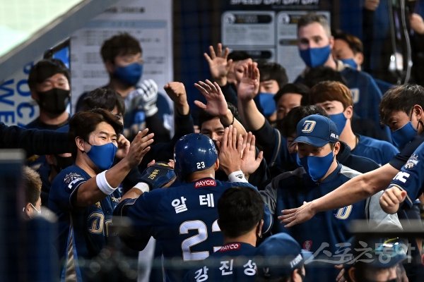 21일 서울 고척스카이돔에서 ‘2020 신한은행 SOL KBO리그’ NC 다이노스와 두산 베어스의 한국시리즈 4차전 경기가 열렸다. 9회초 2사 2루에서 NC 지석훈의 1타점 2루타 때 득점에 성공한 알테어가 동료들의 환영을 받고 있다.