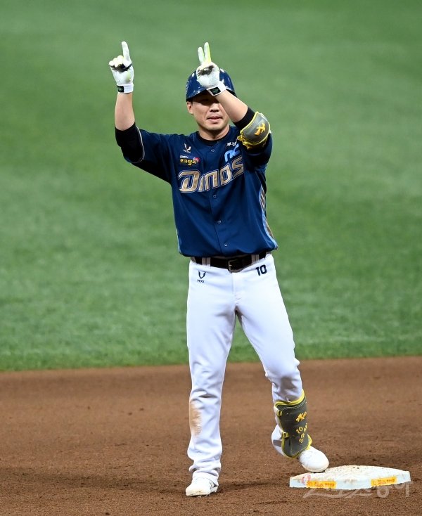 21일 서울 고척스카이돔에서 ‘2020 신한은행 SOL KBO리그’ NC 다이노스와 두산 베어스의 한국시리즈 4차전 경기가 열렸다. 9회초 2사 2루에서 NC 지석훈이 1타점 2루타를 날린 뒤 세리머니를 펼치고 있다.