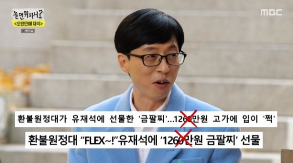 이날 유재석은 김종민, 정재형과 함께 환불 원정대에게 받은 금팔찌 이야기를 꺼냈다. 천만원이 훌쩍 넘는 것으로 알려진 금팔찌 가격에 그는 “나는 아닌 것으로 알고 있었는데 기사까지 났다. 그 브랜드가 아니다”라며 천만원이 넘는 팔찌가 아니라고 해명했다.