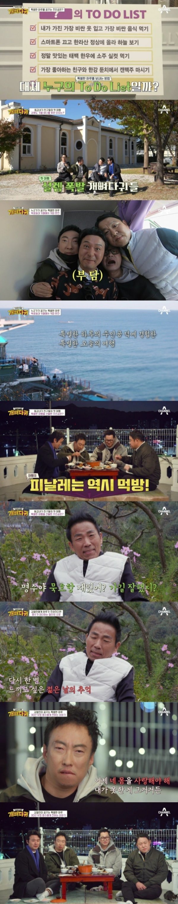 채널A의 인생 중간점검 프로젝트 ‘개뼈다귀’의 김구라 박명수 이성재 지상렬이 암 투병 중인 개그맨 겸 가수 김철민의 부탁으로 ‘특별한 하루’를 체험했다. 동갑내기 친구들과 함께, 평범하면서도 흔치 않은 여행을 즐겁게 즐긴 4멤버는 이 하루가 바로 김철민의 소망이었다는 사실을 알고 먹먹함에 잠겼다.