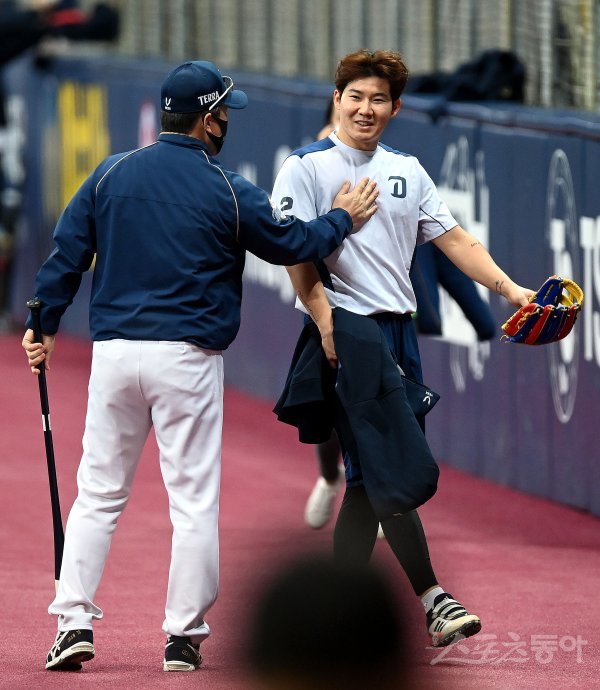 23일 서울 고척스카이돔에서 ‘2020 신한은행 SOL KBO리그’ NC 다이노스와 두산 베어스의 한국시리즈 5차전 경기가 열린다. 경기 전 NC 이동욱 감독이 박민우와 이야기를 나누고 있다.
