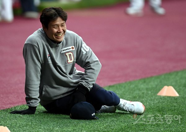 23일 서울 고척스카이돔에서 ‘2020 신한은행 SOL KBO리그’ NC 다이노스와 두산 베어스의 한국시리즈 5차전 경기가 열린다. 경기 전 두산 박세혁이 훈련을 앞두고 환한 미소를 짓고 있다.