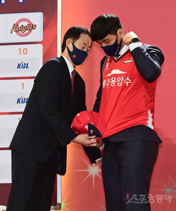 23일 서울 잠실학생체육관에서 열린 ‘2020 KBL 국내신인선수 드래프트’에서 고양 오리온의 지명을 받은 중앙대 박진철이 강을준 감독으로부터 유니폼을 받고 있다.