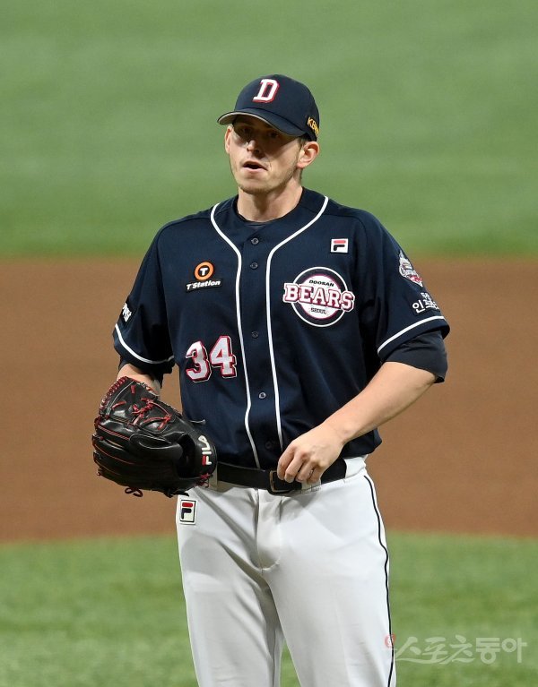 선발 투수로 등판한 두산 플렉센이 4회말 2사 NC 나성범에게 중전 안타를 허용하며 퍼펙트 행진이 깨지자 아쉬워하고 있다.