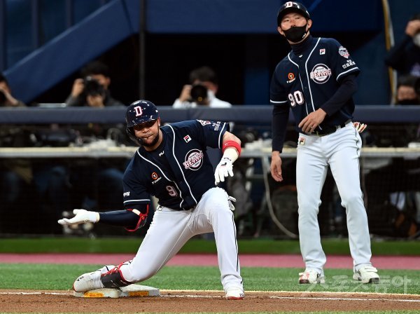 4회초 무사에서 두산 페르난데스가 안타를 날린 뒤 세리머니를 펼치고 있다.