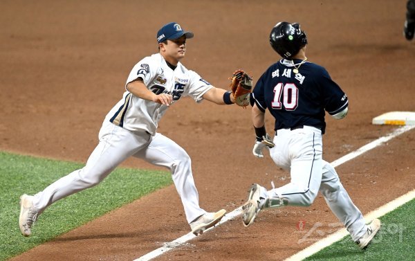 4회초 1사 2,3루 두산 박세혁 1루수 앞 땅볼 때 NC 강진성이 직접 잡아 태그 아웃시키고 있다.