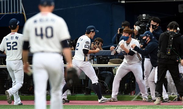 4회초 2사 2, 3루에서 NC 박민우가 두산 허경민의 타구를 아웃시킨 뒤 더그아웃에서 동료들의 환영을 받고 있다.