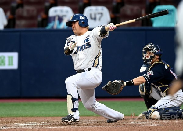 6회말 1사 2루에서 NC 박석민이 1타점 적시타를 날리고 있다.