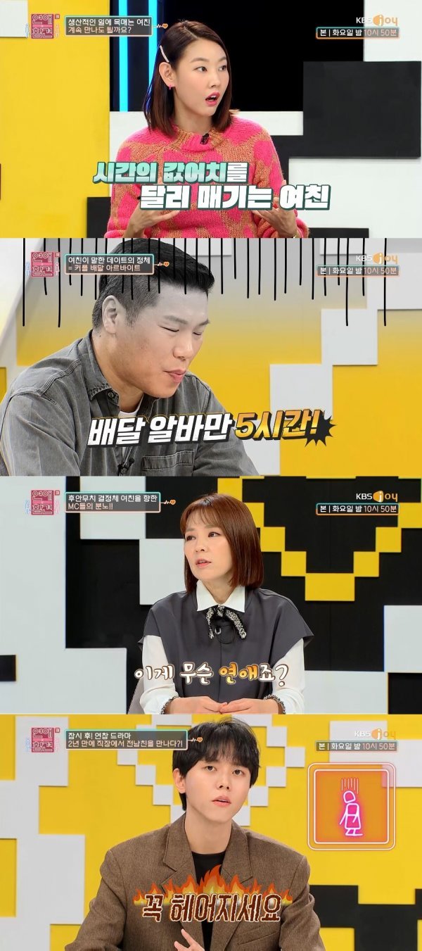 24일 방송된 KBS Joy 예능프로그램 \'연애의 참견 시즌3\' 47회에는 효율성을 중요하게 생각하는 여자친구와 연애중인 20대 후반의 고민남 사연이 공개됐다.