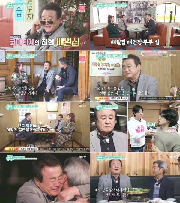 어제 방송에서는 코미디계의 살아있는 전설 배일집이 출연해 그리웠던 친구와 40여 년만에 감동적 재회를 했다. 대한민국 코미디계의 1세대 트로이카인 구봉서, 배삼룡, 서영춘과 함께 활동을 한 배일집은 힘들었던 신인 시절 자신에게 힘이 되어 주었던 소중한 친구를 찾는다고 했다. 그는 가난을 극복하기 위해 앞만 보고 달려오느라 고마운 친구를 제대로 챙기지 못한 것에 대해 후회했다.