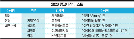 올해 2020 스포츠동아 광고대상에서는 SK텔레콤의 ‘창덕 ARrIang’ 편이 대상을 차지했고, 웅진코웨이 ‘에어매칭필터’ 편은 본상 기업 PR상을, 롯데칠성음료 ‘이런 청량함은 처음이야’ 편, 아모레퍼시픽 ‘아이오페 레티놀 엑스퍼트 0.1%’ 편, KB금융그룹 ‘세상을 바꾸는 금융’ 편이 각각 최우수상을 받았다.