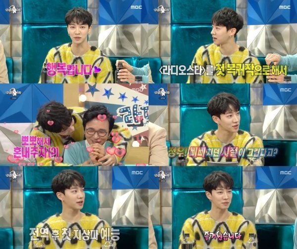 지난달 의무경찰 복무를 마치고 만기 전역한 이기광은 "'라디오스타'를 지상파 첫 복귀작으로 할 수 있게 돼 행복하게 생각한다. 저는 벌써 (사회에) 적응했다"고 자신감을 드러냈다. 특히 "군대에서 규칙적으로 잘 먹고 잘 자니까 키가 0.6~7cm 정도 컸다"고 그간의 변화를 소개해 웃음을 자아냈다. 안영미 또한 "이기광이 훤칠해졌다"며 덧붙였다.