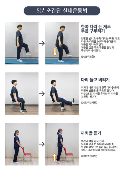 다리 들고 버티기, 까치발 들기, 다리 들어올리기 등 생활 속 간단한 운동법으로도 근력 운동 효과를 볼 수 있다. 특히 겨울철은 근육이 감소하고 관절 지지력이 약해지기 쉬우므로 운동을 규칙적으로 꾸준히 해서 근력을 높여주는 것이 필요하다.