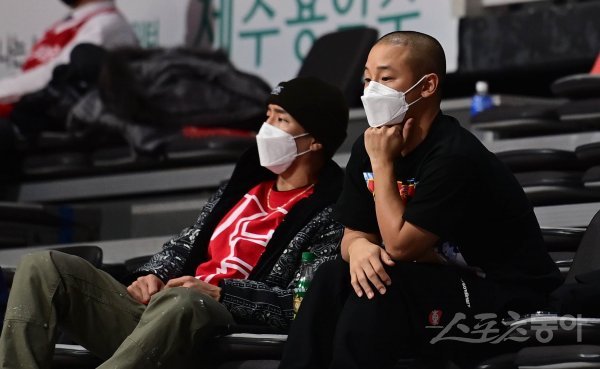 3일 경기도 고양체육관에서 열린 ‘2020-2021 현대모비스 프로농구’ 고양 오리온과 울산 현대모비스의 경기에서 그룹 마이트마우스의 상추와 쇼리가 관람하고 있다.