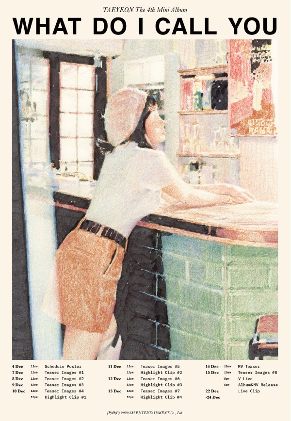 오늘(4일) 0시 태연의 각종 SNS 소녀시대 계정을 통해 공개된 스케줄 포스터에는 태연의 네 번째 미니앨범 ‘What Do I Call You’(왓 두 아이 콜 유)와 관련된 다채로운 콘텐츠 오픈 일정이 담겨 있어 음악 팬들의 기대감을 높였다.