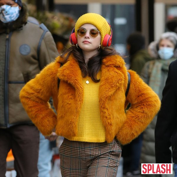 7일(현지시간) 미국 뉴욕에 한 영화 촬영장에서 포착된 셀레나 고메즈는 옐로 니트와 체크무늬 팬츠를 입고 퍼 재킷과 옐로 비니를 매치한 패션으로 돋보이는 패션 감각을 선보였다.