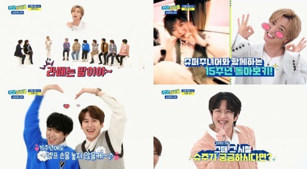 데뷔 15주년을 맞이한 슈퍼주니어는 9일 오후 5시 MBC M과 MBC 에브리원에서 방송되는 ‘주간아이돌’에 출연한다.