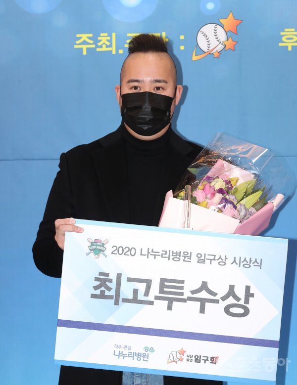 10일 오전 온라인으로 진행된 ‘2020 나누리 병원 일구상’에 참석한 두산 유희관이 최고투수상을 수상하고 있다.