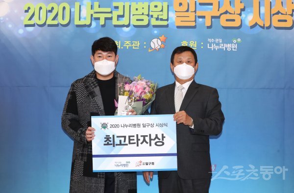 10일 오전 온라인으로 진행된 ‘2020 나누리 병원 일구상’에 참석한 NC 양의지가 최고타자상을 수상하고 있다.