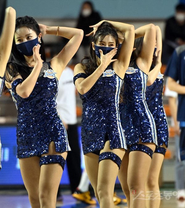 10일 전주실내체육관에서 열린 ‘2020-2021 현대모비스 프로농구’ 전주 KCC와 고양 오리온 경기에서 치어리더가 공연을 펼치고 있다.