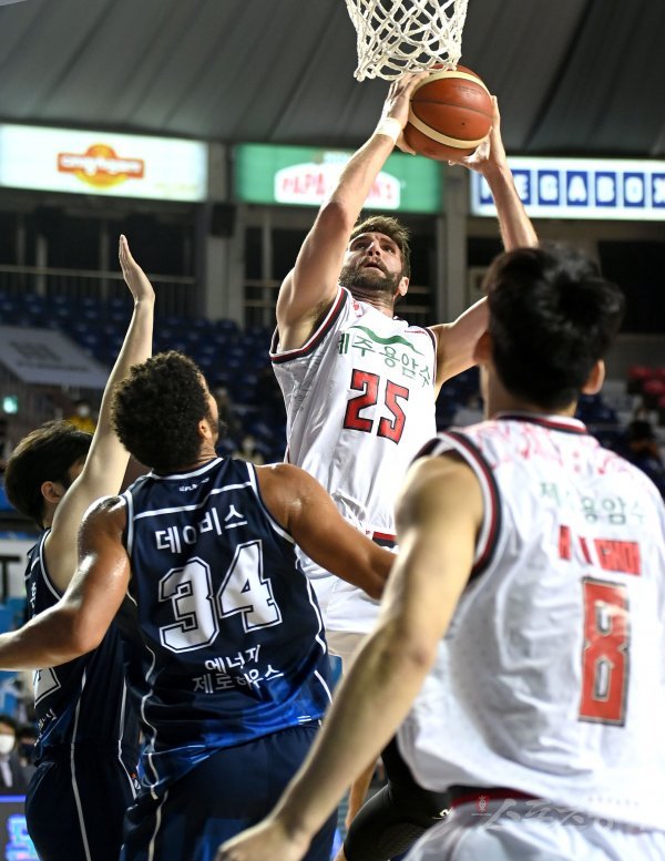 10일 전주실내체육관에서 열린 ‘2020-2021 현대모비스 프로농구’ 전주 KCC와 고양 오리온 경기에서 오리온 위디가 KCC의 수비를 뚫고 골밑 슛을 하고 있다.