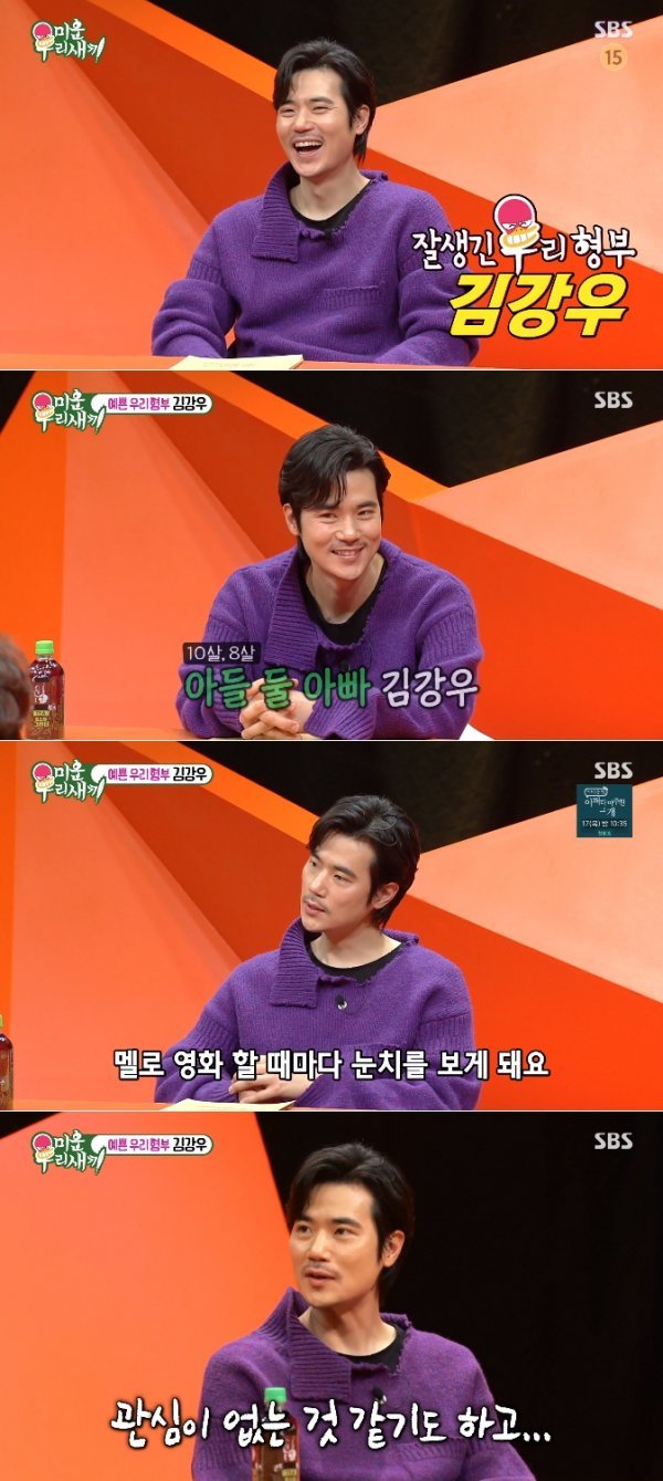 13일 밤 방송된 SBS ‘미운우리새끼’에는 배우 김강우가 스페셜 MC로 함께했다. 올해 마흔셋이라는 김강우는 결혼 11년차로 10살과 8살 아이들을 슬하에 두고 있다고. 이에 ‘모벤져스’는 부러움의 눈빛으로 김강우를 바라봤다. 김강우는 “결혼 10주년인데 눈 깜짝 할 사이에 지나온 것 같다. 예전에는 어떻게 평생 50년을 같이 살지 싶었는데 그렇게 될 것 같다”고 털어놨다.