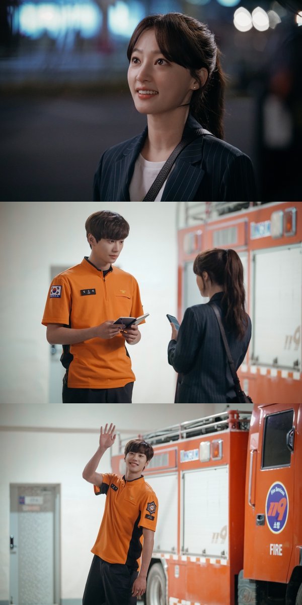 공개된 사진 속 서지성과 정국희는 고래 소방서 앞에 마주 서 있다. 정국희를 바라보는 서지성의 눈빛과 표정에는 이제 막 사랑을 시작한 듯한 설렘과 떨림, 수줍음 등이 담겨 있다. 이는 조심스럽게 서지성을 바라보는 정국희 역시 마찬가지. 마지막 사진에서는 정국희가 전에 없던 환한 미소를 지으며 서지성을 향해 크게 손을 흔들고 있어, 보는 사람까지 설레게 만든다.