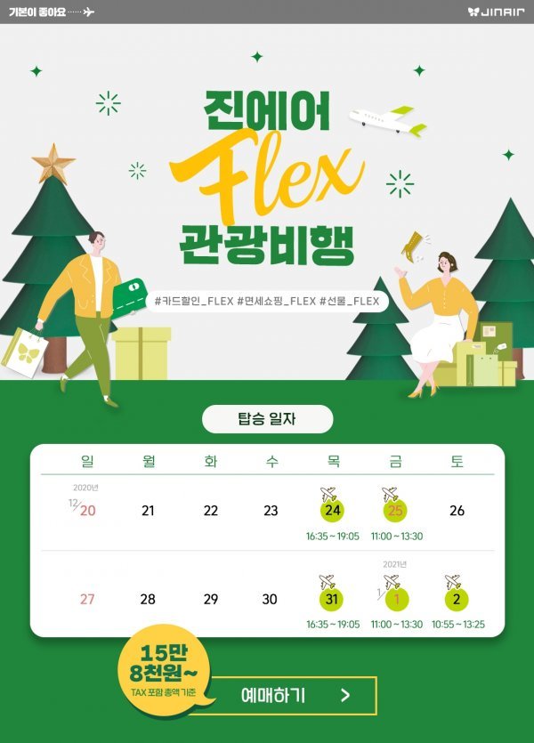 입국 후 코로나19 방역을 위한 격리조치, 진단검사가 면제되고 면세품 구입이 기존 일반 해외여행과 동일하게 적용되는 것이 특징이다. 진에어는 24일, 25일, 31일, 2021년 1월1일, 2일에 국제선 관광비행을 운항할 예정이다.