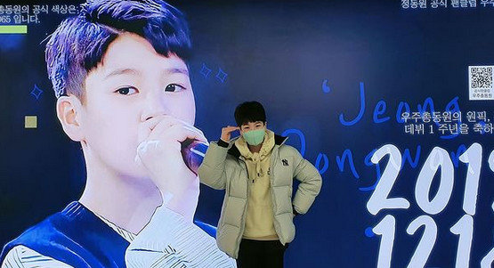 함께 공개한 사진 속 정동원은 자신의 데뷔 1년을 맞이해 팬클럽 ‘우주총동원’이 마련한 이벤트 전광판 앞에 서있다. 직접 쪽지를 남기는 뒷모습이 귀엽다.