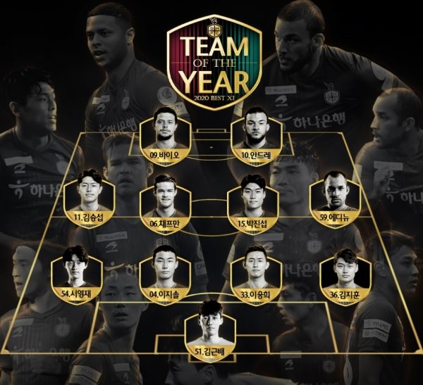 프로축구 K리그2 대전하나시티즌이 팬 투표를 통해 2020시즌 한 해동안 가장 인상적인 활약을 펼친 11명의 선수를 선정했다.