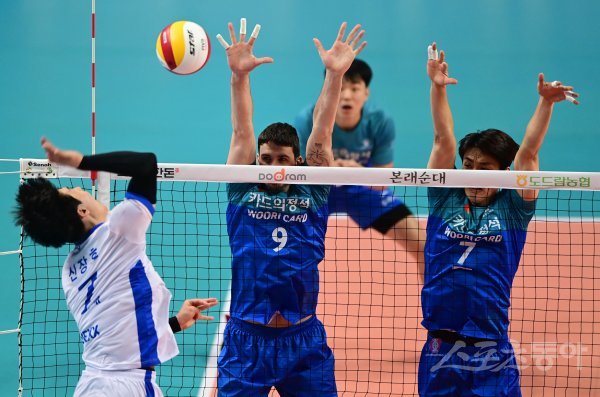 20일 서울 장충체육관에서 ‘2020-2021 도드람 V리그’ 서울 우리카드와 대전 삼성화재의 경기가 열렸다. 우리카드 알렉스와 하현용이 블로킹을 하고 있다.