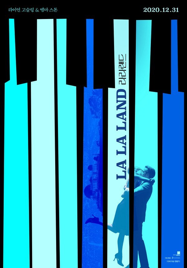 이번 재개봉을 기념하여 공개된 포스터 2종 중 첫 번째 포스터는 ‘라라랜드’의 키 컬러인 비비드한 블루 톤과 피아노 건반을 배경으로 ‘미아’와 ‘세바스찬’이 정열적인 키스를 나누는 장면이 담겨있다. 두 번째 포스터는 영화 후반부 ‘미아’와 ‘세바스찬’의 로맨틱한 상상이 시작되는 순간의 감동을 그려냈다.