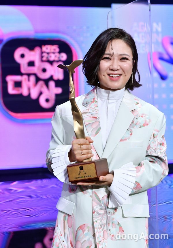 개그맨 김숙이 24일 오후 온라인으로 진행된 \'2020 KBS 연예대상\'에서 대상을 수상한 뒤 포즈를 취하고 있다. 이날 김숙, 김종민, 샘 해밍턴 가족, 이경규, 전현무 5팀이 올해 대상을 놓고 치열한 경쟁을 펼칠 예정이다. <사진 제공 = KBS>동아닷컴 국경원 기자 onecut@donga.com