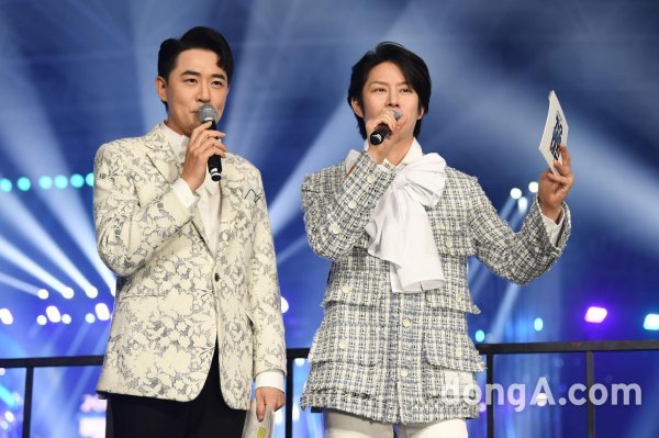 방송인 붐(왼쪽)과 가수 김희철이 25일 오후 진행된 \'2020 SBS 가요대전 in DAEGU\'에서 사회를 보고 있다.