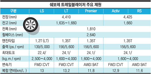 개소세 인하를 적용한 트레일블레이저의 기본 가격은 LS 1959만 원, LT 2185만 원, Premier 2445만 원, ACTIV 2523만 원, RS 2573만 원이다. 더 뉴 트랙스의 가격은 LS 디럭스 1827만 원, LT 2027만 원, Premier 2244만 원, 레드라인 LT코어 2141만 원, 레드라인 Premier 2279만 원이다.