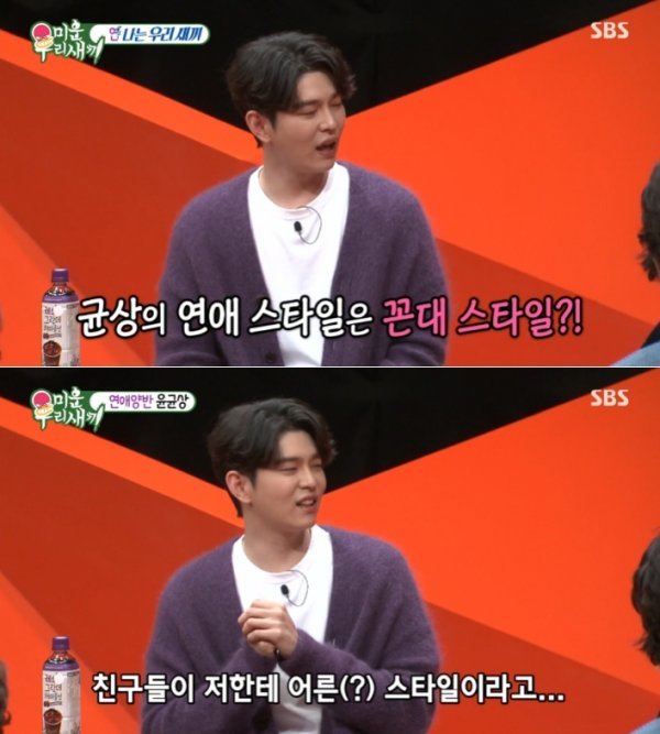윤균상은 10일 밤 방송된 SBS ‘미운우리새끼’에서 “연애할 때 꼰대 스타일이라던데”라는 말에 “친구들이 ‘어른 스타일’이라고 하더라”고 인정했다. 그는 “클럽 가는 게 흠은 아닌데 그런데 다니는 사람을 안 좋아한다. 연락 안 되는 것도 싫어하고 예의 바르지 못한 것도 싫어한다”고 밝혔다. 이에 신동엽은 “고지식하다기보다는 예절을 따지는 스타일인 것”이라고 말했다.