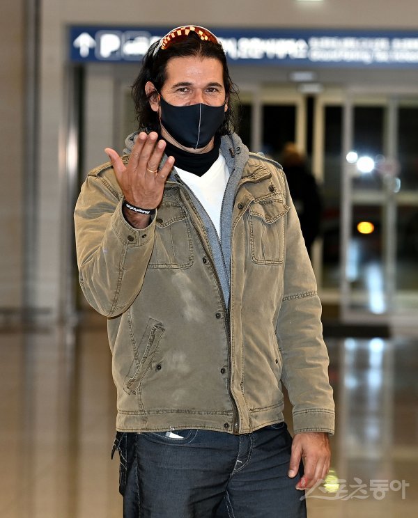 수베로 감독이 입국장을 나서며 카메라를 향해 포즈를 취하고 있다.