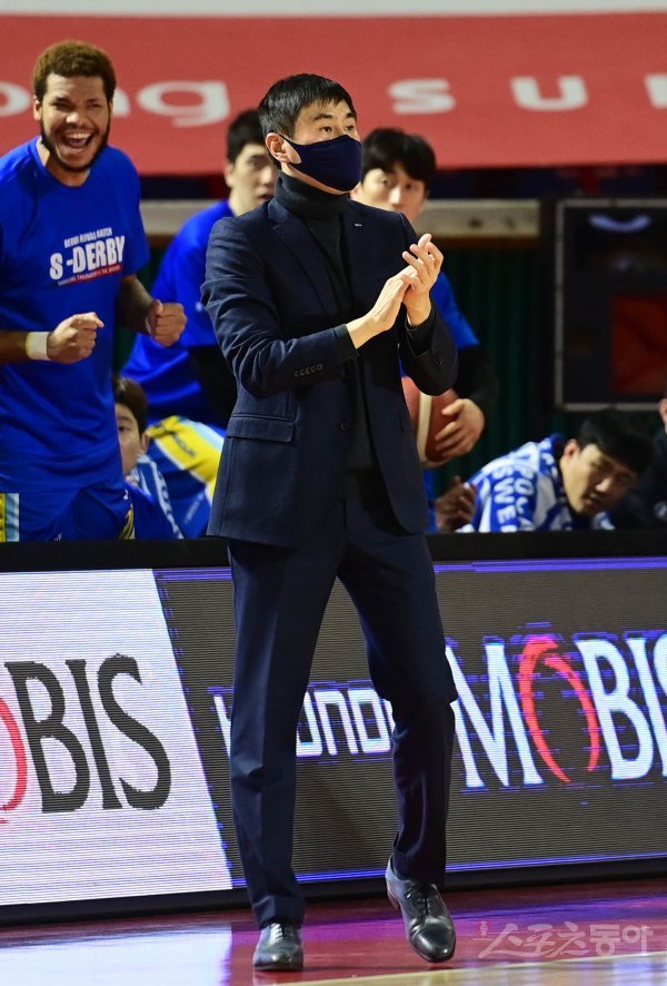 11일 서울 잠실학생체육관에서 열린 ‘2020-2021 현대모비스 프로농구’ 서울 SK와 서울 삼성의 경기에서 삼성 이상민 감독이 득점을 성공시킨 선수들을 향해 박수치고 있다.