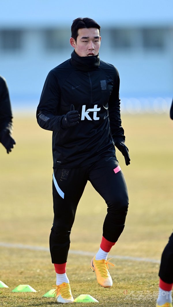 송민규가 12일 강원도 강릉종합운동장에서 도쿄올림픽을 대비한 축구 올림픽대표팀의 새해 첫 소집 훈련에서 몸을 풀고 있다.