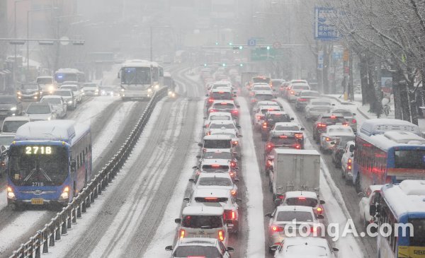 서울과 수도권에 함박눈이 내리고 있다. 12일 오후 서울 서대문 사거리에서 차량들이 거북이 걸음을 하고 있다. 기상청은 "12일 오후 수도권을 중심으로 함박눈이 내리고 있다. 강한 눈이 내리는 시간대가 퇴근시간과 맞물려 교통 혼잡이 예상되고, 차량 운행시 충분한 안전거리를 확보하기를 바란다"고 전했다.