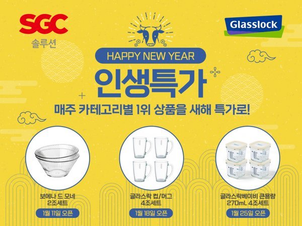 SGC솔루션(구 삼광글라스)이 18, 25일 글라스락 공식몰에서 ‘해피뉴이어 인생특가 기획전’(사진)을 진행한다.