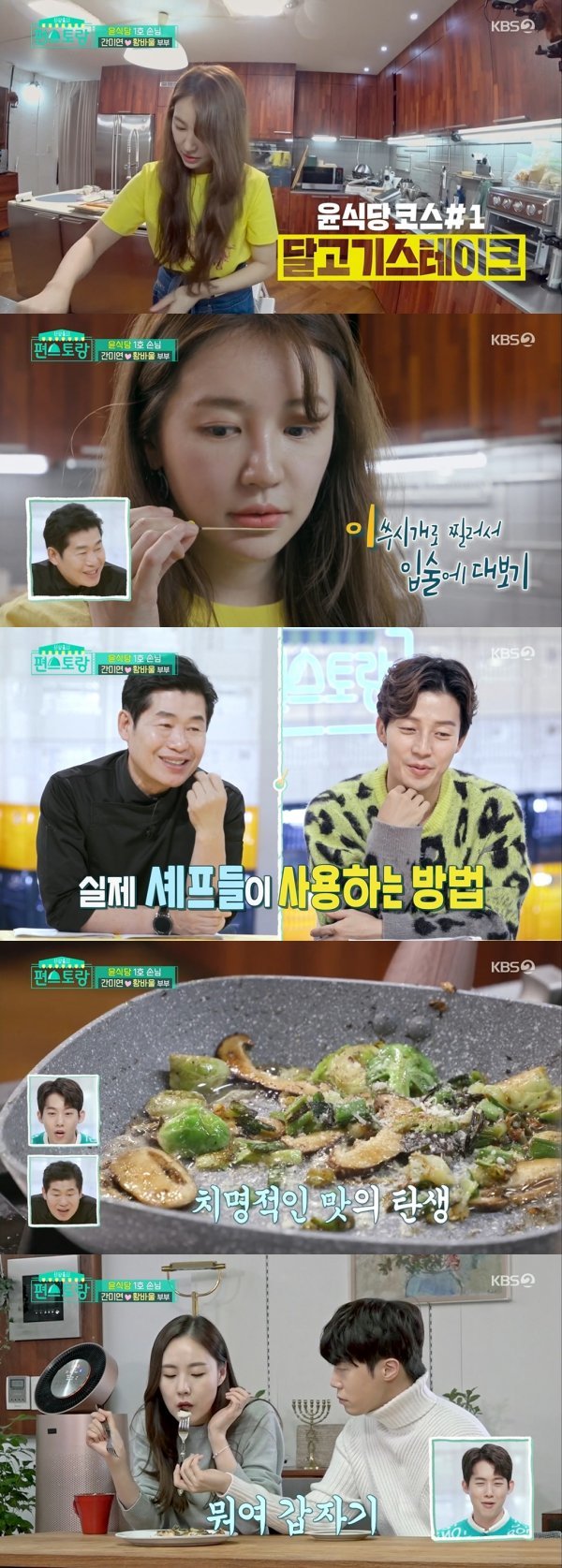 이날 방송에서는 ‘어묵’을 주제로 한 20번째 메뉴 개발 대결이 계속됐다. 그중 ‘편스토랑’ 대표 금손 편셰프 윤은혜는 20년 전 베이비복스 시절부터 우정을 이어오고 있는 간미연과 그녀의 남편 황바울을 집으로 초대했다. 옥수동 윤식당의 공식 1호 손님인 것. 간미연 황바울 부부를 위해 윤은혜는 달고기 스테이크, 트러플 닭가스, 어묵 라자냐 3단 코스 요리를 준비했다.