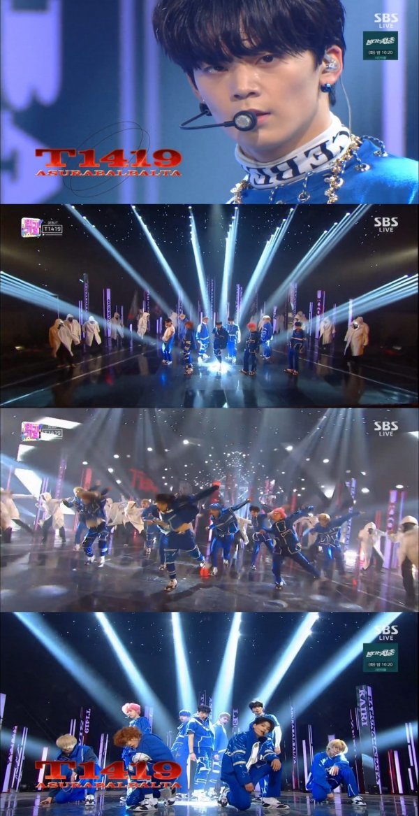 신예 T1419가 임팩트 있는 데뷔 무대로 확실한 눈도장을 찍었다. T1419는 17일 방송된 SBS '인기가요'에서 데뷔곡 '아수라발발타(ASURABALBALTA)' 무대를 선사했다.