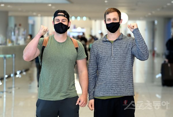 프로야구 KIA 외국인 선수 프레스턴 터커와 대니얼 멩덴이 18일 인천국제공항을 통해 입국해 카메라를 향해 포즈를 취하고 있다.