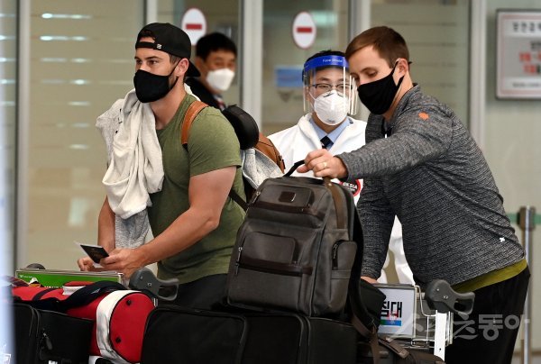 프로야구 KIA 외국인 선수 프레스턴 터커와 대니얼 멩덴이 18일 인천국제공항을 통해 입국해 방역관계자의 안내를 받고 있다.