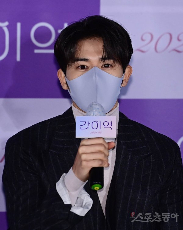 배우 김동준이 20일 서울 광진구 자양동 롯데시네마 건대입구점에서 열린 영화 ‘간이역’ 언론시사회에서 질문에 답변하고 있다.